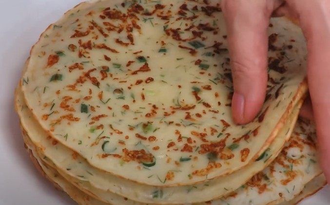 4. Кстати если у вас получилось слишком густое тесто можно в него добавить немного молока. Я пожарила уже все блинчики. Посмотрите сколько их у меня получилось! Вот такая замечательная стопочка! И сейчас будем подавать к столу! Блины получаются очень эластичные, их легко свернуть! Я буду их подавать сворачивая вот такими треугольниками. И конечно, подавать будут вместе со сметаной. Это очень вкусно! Обратите внимание, видите как красиво поджариваются кусочки сыра. Очень красивый получается у блинов рисунок! Я очень люблю готовить такие блины на завтрак! Они получаются и сытные и очень вкусные. Я сейчас попробую со сметаной. Это просто класс! Они получаются такие сырные, такие очень аппетитные! Здесь пахнет и лучок, и укроп! Очень Вкусно! Рекомендую приготовьте и порадуйте всех своих родных и близких! Я желаю всем приятного Аппетита!Видео рецепт ютуб ниже 👇