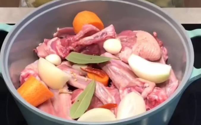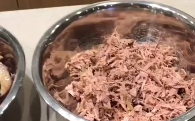 2. Воду мы не добавляем, так как из утки выделиться много сока и жира, в котором утка и будет томиться. Когда утка будет готова, снимаем ее с плиты и остужаем. Можно оставить ее остывать на ночь. Затем достаём из кастрюли мясо, а жир не выливаем, так как он нам понадобится. Разбираем мясо на волокна руками или вилками, убирая кожу и кости.