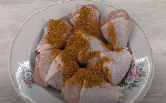 2. Картофель, которой мелкий, я его не режу, так оставляю. Тот, который покрупнее, режем на 2 - 3 части. В картофель добавляю только соль. Если хотите, можно добавить какую-то приправу для картофеля. Поверх картофеля выкладываем курицу. Курица даст достаточно сока с приправой и картошка хорошо пропитается, поэтому никаких приправ отдельно до картофеля не добавляю. Берём фольгу, отрываем кусочек подходящего размера, накрываем и ставим в духовку, разогретую до 180 градусов на 1 час.
