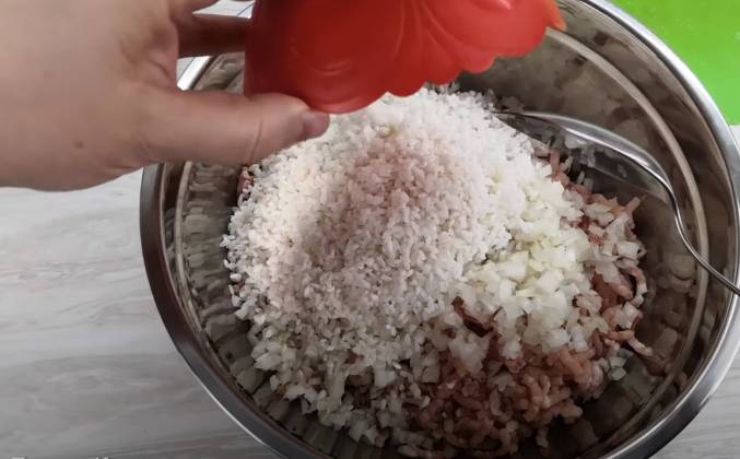 2. Теперь займемся фаршем. Для фарша и я взяла килограмм мяса. Мясо у меня разное - свинина и курица. У вас может быть свинина с говядиной, то есть, как угодно. Добавила 2 средние луковицы мелко нашинкованные. Сразу добавляю промытый рис. Рис никогда до полуготовности не отвариваю, он и так, ребята, у вас, поверьте, приготовиться прекрасно. Риса взяла 5 столовых ложек с горкой, хорошо промытые, не забываем. 1 чайная ложка паприки, соль по вкусу и немножко черного молотого перца тоже по вкусу. Всё хорошо перемешаем и фарш готов. Теперь будем заниматься непосредственно заворачиванием голубцов. Вот те листики, которые небольшие, у которых я подрезала центральную жилку. Их я заворачиваю как обычно. Это способ, самый распространенный, его знают все. Вот таким образом, думаю, здесь никого учить не надо.