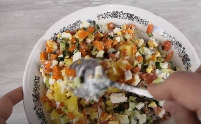 3. Бывает в этом салате людям не хватает какой-то остринки. Сначала попробуйте так, потом можно добавить или чёрный молотый перец по вкусу, или зубчик чеснока, но это уже на любителя, я не добавляю. Всё хорошо перемешиваем и салат готов. Теперь его можно переложить в какой-нибудь красивый салатник и подавать к столу. Такой салат можно запросто поставить на новогодний стол. Друзья, я желаю вам приятного аппетита!Видео рецепт ютуб ниже 👇