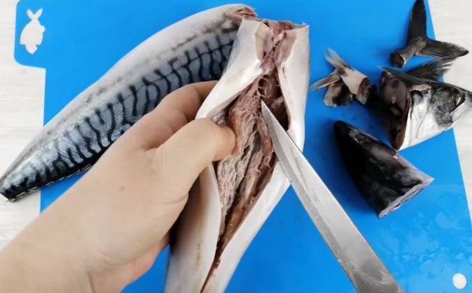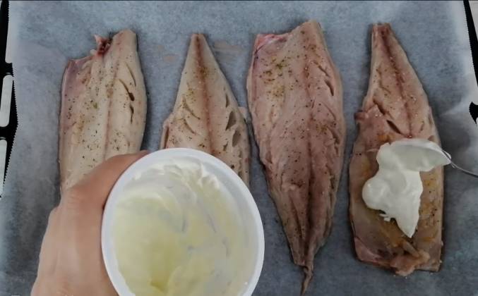 2. Вот таким образом, хорошенько промываем и очищаем добела. Теперь будем разрезать вдоль по спинке, вырезая верхний плавник. Теперь с помощью острого ножа надо от хребта отделить филе. Отделила я филе. Теперь беру противень, застеленный пергаментной бумагой и выкладываю скумбрию на пергамент вот таким образом. Теперь берем немножко соли и слегка присаливаем. И приправу для рыбы. Здесь уже, какую больше любите, у меня самая обычная универсальная приправа для рыбы. Затем берем сметану, буквально 1 - 1,5 чайные ложки на одно филе и так вот размазываем по всей поверхности филе. Теперь берем обжаренный лук с морковью. Ребята посмотрите и не делаете моих ошибок)) Я пока рыбой занималась, у меня морковь немножко подгорела, поэтому не забывайте следить за морковью)))