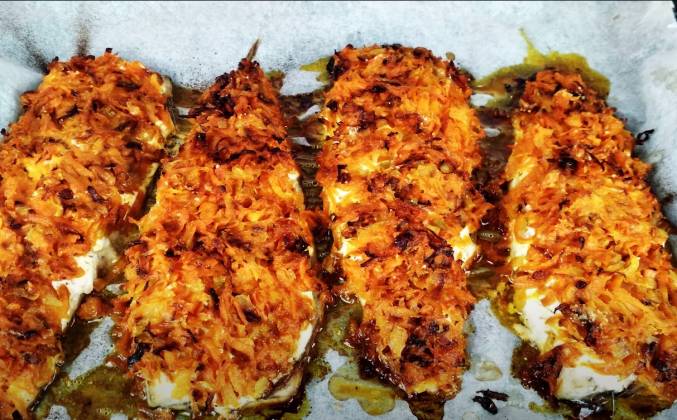 3. Нельзя, чтобы она подгорела, нам еще это в духовку ставить. Теперь распределяем обжаренный лук с морковью также по всей поверхности филе рыбы. Как видите, этого количества как раз хватает. То есть одна морковь и одна луковица уходит на одну рыбу. Теперь ставим это всё в духовку, разогретую до 180 градусов на минут 25-30, то есть готовится очень быстро. Получается сочная и нежная, хороша как в горячем, так и в холодном виде. Муж предпочитает больше в холодном виде. Мне нравится как в тёплом, так и в холодном. В холодном, кстати, знаете, немножко напоминает рыбу под маринадом. Правда нет той остроты и кислинки нет, но что-то похожее есть.Видео рецепт ютуб ниже 👇