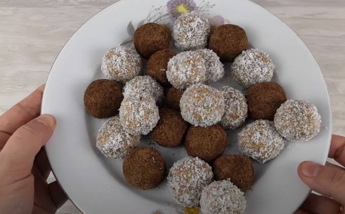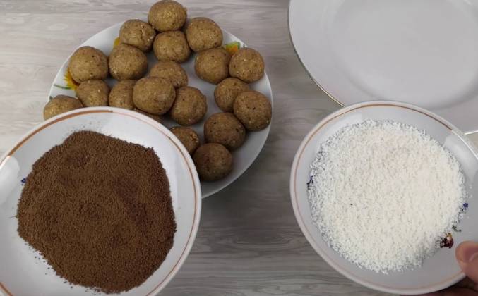 3. Формируем конфетки из всей нашей массы. Накрутила я шариков вот таких)) Теперь буду их обваливать. Для этого я беру кокосовую стружку и какао. Вы же можете брать всё, что угодно - можно взять кондитерскую цветную посыпку, можно взять тертый шоколад. Ну, кому, что больше нравится. У меня что было под рукой - какао и стружка. Кстати, в кокосовой стружке моим домашним нравится больше, чем в какао. Но, делаю пополам, так для красоты))) Теперь нам нужно все это обвалять и смотрите, вот такая получается красота! Нужно убрать в холодильник, минимум на 1 час, чтобы они хорошо охладились. А потом, пожалуйста, можно по-разному сервировать и ставить на стол!Видео рецепт ютуб ниже 👇