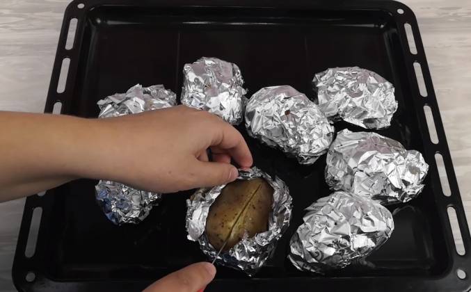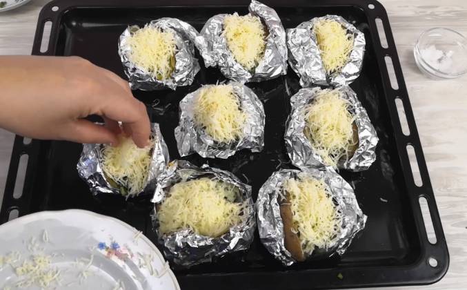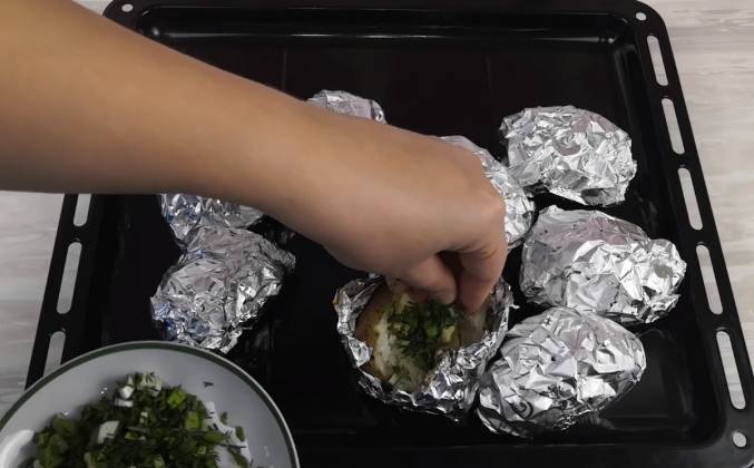2. Сами тем временем порежем небольшой пучок укропа и зеленого лука. На мелкой терке натрем 100 грамм сыра. Для моей картошки будет достаточно и 100 грамм. Через час мой картофель оказался готовым. Если картофель будет у вас крупный, то возможно больше времени понадобится. Теперь острым ножом разрезаем картофель пополам вдоль, вместе с фольгой. Режем, так открываем здесь, только очень осторожно, чтобы не обжечь пальцы, потому что горячо ужасно. Картошку нам надо пополам, с помощью вилки лучше это, конечно, делать. Вот таким образом, фольгу до конца не разрезайте, чтобы такая тарелочка, горшочек у нас осталась. Вилкой разомнем картошку немножко. Чуть - чуть добавим соли по вкусу. Небольшой кусочек сливочного масла, затем порезанную зелень. И сверху будет сыр.