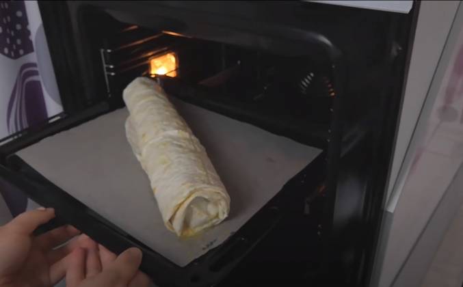 3. Теперь выкладываем подготовленные яблоки на смазанный лаваш. Выкладываем их на один край. Для чего это делается? Для того чтобы хорошо скрутить рулет и никуда не убежали соки яблочные. Вот так распределяем, отступив от краев. И, да, чуть не забыла, берём одно яйцо, перебитой вилочкой. И желательно смазать вот так яйцом краешки, чтобы уж наверняка все запечаталось. Но, это уже на ваше усмотрение. В принципе, можно обойтись и без этого. Вот так закручиваем, краешки делаем вовнутрь, чтобы возможности уж никакой не оставить для убегания сока. Очень аккуратно скручиваем рулет. И вот, смотрите, дефект, кстати, тоже хорошо закрутился. Я думаю, все должно получиться.