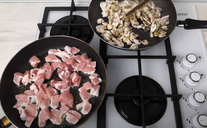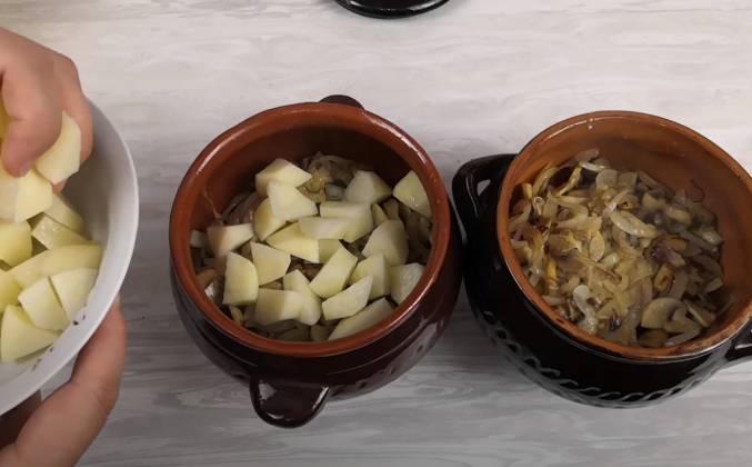 2. Периодически помешиваем грибы. Соль в грибы не добавляем, чтобы они нам никакой сок не пускали, а обжаривались. В мясо тоже пока соль перец не кладем, просто обжариваем. Грибы у нас уже достаточно симпатичные стали. В этот момент добавляем лук к грибам и маленький кусочек сливочного масла, буквально грамм двадцать. Это для такого вкусного сливочного аромата. Когда мясо обжарилось, кладем соль и перец по вкусу. Теперь все хорошо перемешаем и будем с огня убирать. Лук с грибами еще немножко потушатся. Теперь берем горшки, ничем их, конечно, не смазываем. Распределяем мясо по горшкам, поверх мяса будем выкладывать лук с грибами. Делим их примерно одинаково.