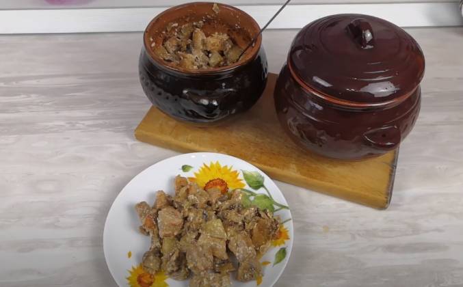 4. Распределяем по горшочкам заливку. Всё, теперь накрываем крышечками и отправляем в духовку, разогретую до 180 градусов на полтора часа. Почему так долго? Потому что горшки нагреваются очень долго, но, правда, и тепло они держат тоже долго. Обычно у меня все едят это прямо из горшочков, но выложу на тарелочку, чтобы вам показать насколько хорошо приготовилось мясо. Достаточно вилочкой прикоснуться к нему и оно уже разваливается. Ребят, это очень вкусно! Это очень ароматно! Муж у меня просто в диком восторге от этого блюда!Видео рецепт ютуб ниже 👇