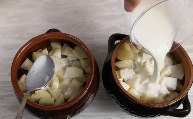 3. Теперь немножко нужно добавить соль, так как грибы мы не солили. И картошка. У меня 4 картофелины среднего размера, то есть по две на горшок. Можно, в принципе, и побольше картошки, но я не люблю когда там из горшков начинает все выпрыгивать))) Картошку теперь тоже нужно немножко посолить и будем делать заливку. Для заливки у меня 150 грамм сметаны. Жирность сметаны может быть любая, у меня 15 процентов. Добавляем к сметане примерно 100 миллилитров воды и добавляем чеснок. Я взяла 1 зубчик, потому что он очень крупный у меня. Если мелкий, можете пару зубчиков. Выдавливаем через пресс и теперь хорошо все перемешаем и этой заливкой будем заливать наше мясо с картошкой.