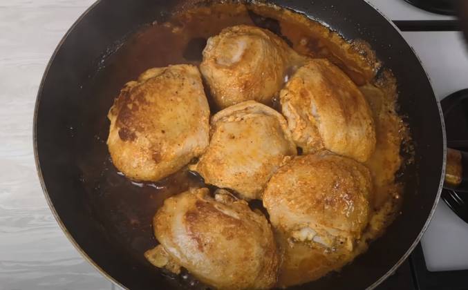 3. Достаём, открываем, она у нас очень хорошо промариновалось, сейчас буду её доставать и готовить. Я буду готовить на сковородке, а вообще эту курицу можно приготовить, как угодно - можно запечь в рукаве в духовке, если добавить туда картошки, то у вас еще курица получится сразу с гарниром.Но лучше всего эта курица получается на мангале. Я смазываю сковородку слегка растительным маслом. Выкладываем курицу, накрываю это все сейчас тарелочкой подходящего диаметра и ставлю груз, то есть я буду готовить курицу по примеру цыпленка табака. Но это не значит, что вот прям так вам нужно готовить, вы, я еще раз повторюсь, можете готовить, как угодно - хоть просто потушить под закрытой крышкой, либо просто это обжарить. То есть, это уже, как вашей душе заблагорассудится, так и делайте, хотите в духовке запекайте.