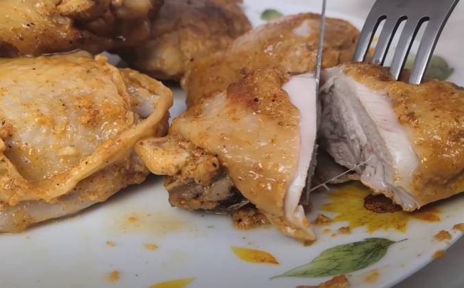 4. Это тоже очень и очень вкусно, но лучше всего, я повторюсь, это на мангале курица выходит. Перевернула, опять накрыла это все тарелочкой, поставила груз. Где-то минут по 15 на среднем огне с обеих сторон я обжаривала курицу. Вот, посмотрите, какая она получается яркая, красивая и практически готовилась без масла. Сами видели, там буквально пол чайной ложки масла. Вот сейчас я буду её выкладывать и покажу вам уже потом в разрезе, как она выглядит. Курица получается очень - очень нежная и мягкая. Сочная и вкусная, с очень красивой и вкусной корочкой. Вот, смотрите, режется прекрасно, не резиновая.Видео рецепт ютуб ниже 👇