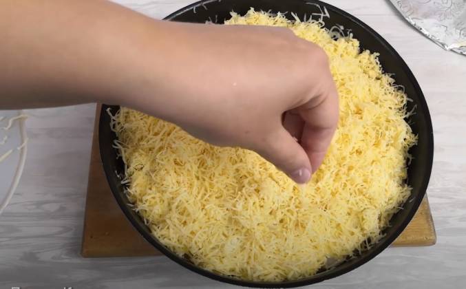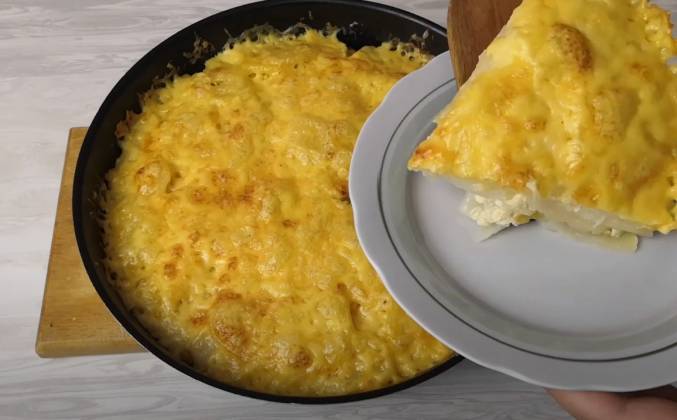 4. Теперь мы берем еще 100 - 150 грамм сыра, натертого на мелкой тёрке, распределяем по поверхности и все это мы отправим опять в духовку только уже разогретую до 200 градусов минут на 10-15 до образования румяной и красивой корочки. У меня ушло 12 минут. Такая красота получилась. Нужно дать чуть-чуть остыть, сильно не надо остужать, это блюдо нужно подавать достаточно теплым. Сейчас я вам покажу, какое оно получается. Вот такое слоистое и очень-очень вкусное. Ребята, такое блюдо с хрустящей корочкой, ярко выраженным сливочным вкусом и очень очень сытное, как самостоятельное блюдо идет. Можно подать с овощным салатом.Видео рецепт ютуб ниже 👇