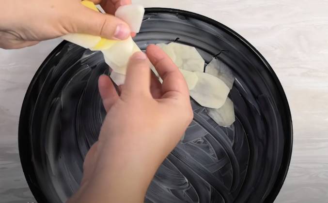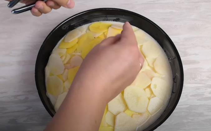 2. На дно формы выкладываем пластины из картофеля. Причём укладываем так, чтобы дна формы было не видно, хороший такой слой картофеля. Затем берем соус и ложек 5-6 столовых вливаем на картофель, поливаем этим соусом картошку. Затем у нас снова пойдет слой картофеля и так мы будем чередовать картофель и соус. Можете картофель еще сверху немножко посолить, но это в том случае, если у вас соус недостаточно посолен. У меня соус спосолен вполне себе достаточно, поэтому картофель отдельно не солила. Обращаю ваше внимание, что самый верхний слой картофеля поливать соусом уже не нужно. Здесь мы берем 1 - 2 зубчика чеснока, я беру один, потому как это будут есть и дети.