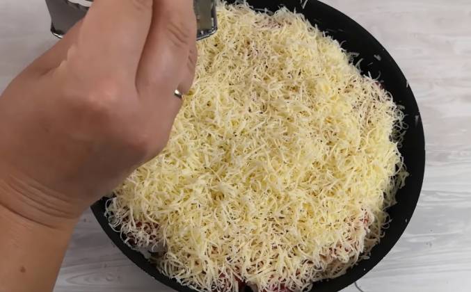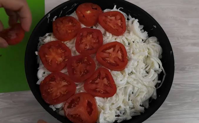 2. Добавляю две ложки сметаны и хорошенько все перемешиваем. Если вдруг у вас сметаны под рукой не оказалось, то на минимальном количестве растительного масла можно лук слегка обжарить и уже использовать вот этот обжаренный лук, уже без сметаны. Лук выкладываем поверх стейков, равномерно его распределяем. Если вы не большие любители лука, можно и поменьше взять. Поверх лука выложим кольца помидор. Теперь берем кусочек сыра и натираем на терке.