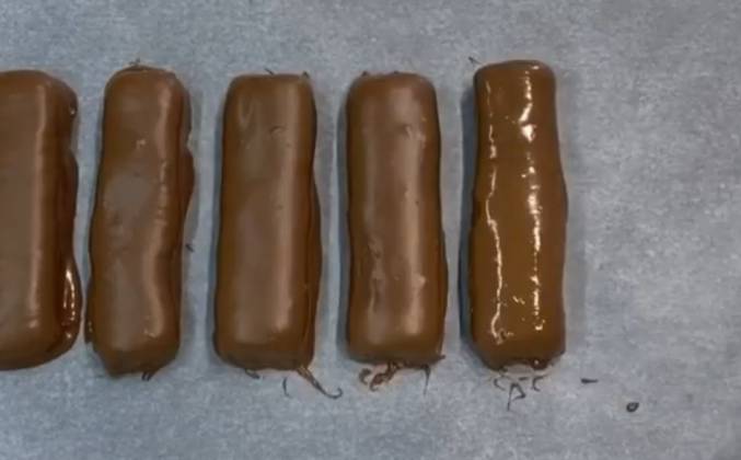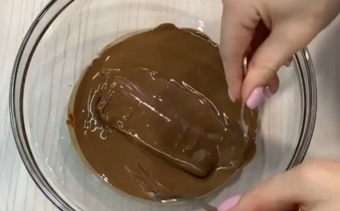 4. После этого достаем и разрезаем на 8 батончиков. Снова убираем в морозилку на 15 минут. Шоколад растапливаем в микроволновке или на водяной бане.