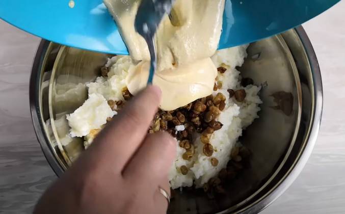 2. Когда рис уже полностью готов, кладем к нему 50 грамм сливочного масла. После того, как полностью масло растворится выключаем кашу и даем ей остыть градусов где-то до 60. Затем перекладываем в удобную миску, в которой удобно мешать будет. Видите, она стала совсем густой. Добавляем изюм, предварительно слив с него воду. Затем берём три яйца и отделяем белки от желтков. И к желткам добавляем оставшийся сахар и хорошенько венчиком или миксером (миксером это удобнее делать) перебиваем до такого пышного, белого состояния. Затем перекладываем к рисовой каше, перемешиваем.