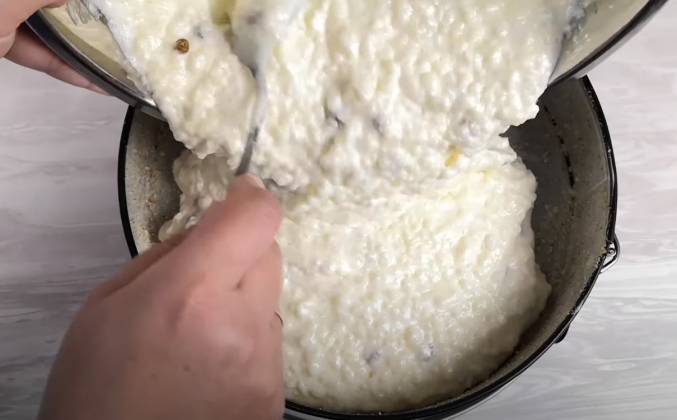 3. В отдельной миске взбиваем белки до пышной, белой массы и затем тоже перекладываем их к рисовой каше и очень аккуратно, снизу вверх, не торопясь, перемешиваем до однородного состояния и всё, наша масса готова. Теперь возьмем форму для запекания. У меня форма в диаметре 26 сантиметров. Дно и бока формы я смазала сливочным маслом. Поверх сливочного масла надо форму присыпать панировочными сухарями, также, и дно, и бока.