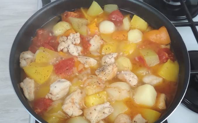 2. Дальше тыква, не удивляйтесь. Картофель молодой, достаточно мелкий беру, чтобы его не резать, а целиком использовать. Помидоры, несколько штук, кабачок. Все ингредиенты порезаны достаточно крупно, чтобы они не сварились в кашу, а остались красивыми и яркими. Перец тоже свой, Оранжевое чудо. Теперь чуть-чуть перемешаем, чтобы лук, который мы положили первым, он там уже в масле начал обжариваться, чуть-чуть перемешаем. Кладем соль по вкусу. Если хотите, то еще добавьте перец. И вольем немного воды, ну, буквально 0,5 стакана, можно даже и меньше, потому что овощи тоже нам дадут сок. Сверху выкладываем курицу.