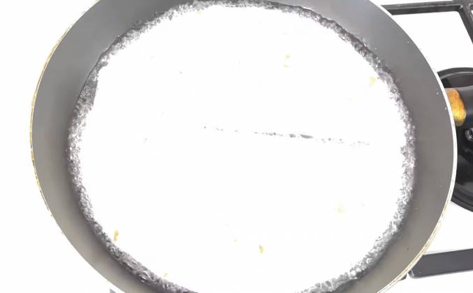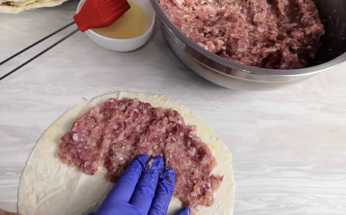 2. И вот таким образом, когда мы свернем, у нас получится два чебурека на сковородке. Берем лист сворачиваем его пополам. Смотрите, очень хорошо видна линия, это серединка. Теперь возьмём одно взбитое яйцо и краешек 1 полукруга смазываем яйцом. Теперь берём фарш и распределяем его на половинке лаваша. Можно делать это рукой, можно делать ложкой, кому как удобно. Стараясь распределить его так, чтобы не заехать за серединку и смазанный яйцом краешек. Распределили мясо, закрываем и с помощью яйца заклеиваем краешек, чтобы все соки у нас остались. Ребята, поверьте яйцо очень хорошо все склеивает.