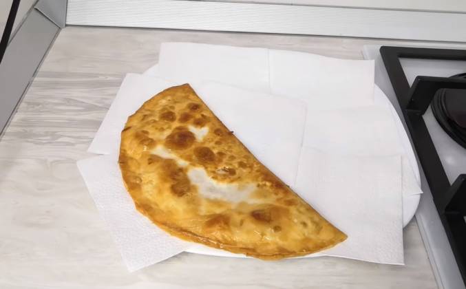 4. Лучше использовать две лопатки для того, чтобы не обрызгаться горячим маслом, потому как это будет очень больно. Обжариваем с другой стороны. Потом выкладываем это всё на тарелку застеленную салфетками, чтобы лишнее масло стекло. Ребят, вот эти чебуреки получаются менее масляные, нежели если это делать классическим способом в тесте. Вот смотрите, какие они получаются в серединке. Полностью готовы, очень сочные и как положено, с хрустящим краешком.Видео рецепт ютуб ниже 👇
