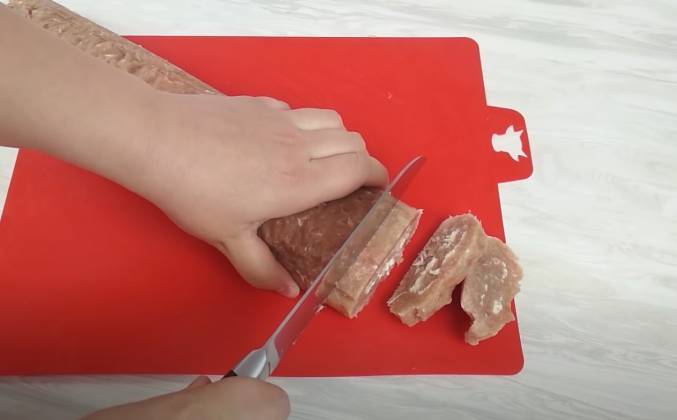 4. Но мука разная, поэтому может быть чуть-чуть побольше или чуть-чуть поменьше. Но в районе 200 граммов и все это хорошо венчиком перемешиваем до однородной консистенции и у нас с вами должно получиться такое тесто. Скажем, как на блины. Я бы сказала не совсем жидкое, но и не сильно густое. У меня три часа прошло, достаю рулет из морозилки. В общем он должен простоять в морозилке столько, чтобы его ножом можно было спокойно резать. Чтобы он не мялся, но в тоже время можно было спокойно ножом разрезать. Режем на такие шайбы, где-то 5-7 миллиметров толщиной. После этого шайбы кладем в кляр обваливаем их в этом кляре, а затем обжариваем на сковороде с растительным разогретым маслом на среднем огне под закрытой крышкой до румяной корочки. После этого достаем и кладём на бумажные салфетки, чтобы лишнее масло у нас стекло.Видео рецепт ютуб ниже 👇