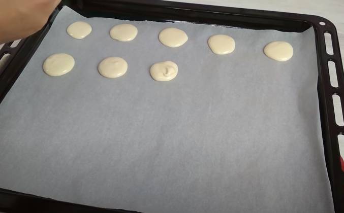 2. Затем возьмем противень, застеленный пергаментной бумагой, и с помощью чайной ложки или кондитерского мешка выложим вот такие небольшие кружочки на достаточно большом расстоянии друг от друга, потому как в духовке они увеличатся в объёме, чтобы они у нас не склеились между собой. И нужно постараться сделать их примерно одинаковыми. Затем выложенные эти "плюшечки" отправим в духовку, разогретую до 180 градусов, минут на 6 - 8. У меня ушло 7 минут. Даем печенюшкам хорошо остыть.