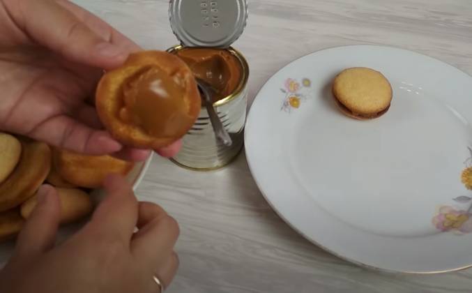 3. Затем берем варёную сгущёнку. Выбирайте хороший продукт, без растительных компонентов. И вот смотрите, момент, почему я говорила, что они должны быть примерно одинаковыми, потому что мы их вот так между собой будем склеивать с помощью варёной сгущёнки. Здесь уже кто как любит, кто побольше сгущёнки, кто поменьше. Так положили сгущенку, между собой слепили. Все, печенюхи наши готовы. И вот так нам нужно поступить со всеми нашими штучками.Видео рецепт ютуб ниже 👇