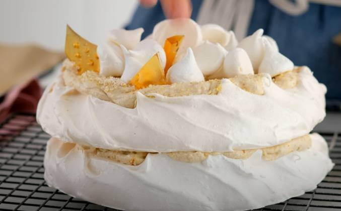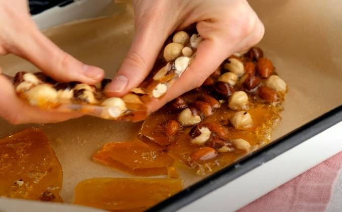 4. Добавьте в сотейник сахар (200 гр), воду (70 гр) и доведите до кипения. Варите на медленном огне. Через 5 минут добавьте лимонный сок и продолжайте варить. Варите до 177 - 180 С, до карамельного цвета. Добавьте 90 гр орехов, перемешайте и вылейте на противень устеленный пергаментом. Вот и меренговые коржи для торта готовы.