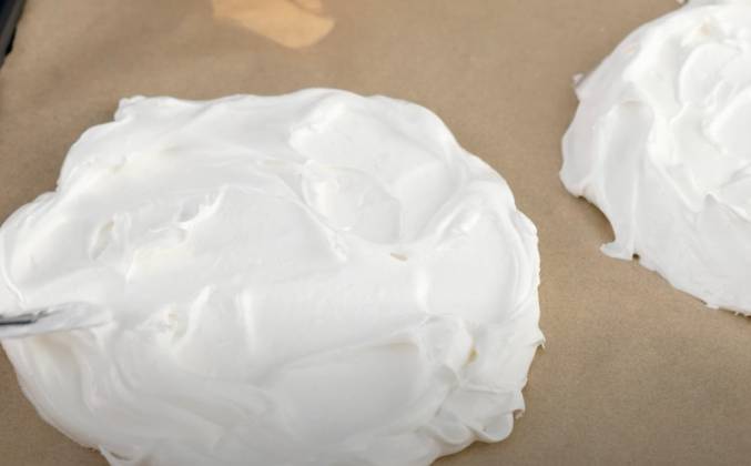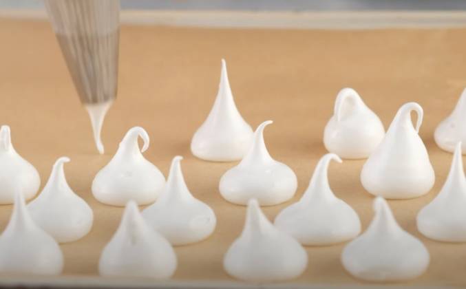 2. Выпекайте при 100 С, 2 часа (режим духовки - верх и низ, без конвекции). Оставшуюся меренгу выложите в кондитерский мешок с насадкой 10 мм и отсадите безе для украшения. Выпекайте безе при 100 С, 1 час (режим духовки - верх и низ, без конвекции). Приготовим КОФЕЙНЫЙ КРЕМ. Нагрейте в сотейнике молоко (200 гр), сахар (40 гр) и кофе эспрессо (30 мл).