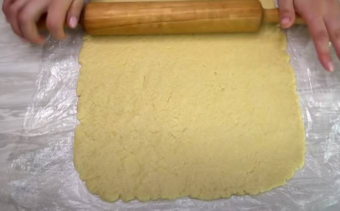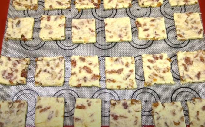2.  Изюм 50 грамм зальем горячей водой дадим ему набухнуть промоем и обсушим, грецкие орехи 50 грамм порубим ножом. Тесто достаем и раскатываем прямоугольник, так как тесто нужно раскатать тонко, я клад пего на пищевую пленку сложенную в 2 слоя, так тесто бес проблематично раскатывается до толщины 2-3 мм. На одну половину пласта кладем начинку изюм и орехи, закрываем второй половиной, накрываем пленкой и раскатываем в прямоугольник практически такой же как и был изначально. 3.  Теперь разрезаем на квадратики. Кладем на противень застеленный бумагой для выпечки и выпекаем в духовке при 180 градусах ровно 10 минут. Здесь главное не передержать, чтобы печенье осталось мягким. Как видите ингредиенты самые обычные, а на вкус печенье получается особенным. Кстати в качестве начинки можно взять все что есть, семечки, цукаты, семена льна, курага, чернослив, мак.