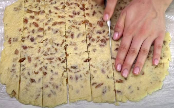 3.  Теперь разрезаем на квадратики. Кладем на противень застеленный бумагой для выпечки и выпекаем в духовке при 180 градусах ровно 10 минут. Здесь главное не передержать, чтобы печенье осталось мягким. Как видите ингредиенты самые обычные, а на вкус печенье получается особенным. Кстати в качестве начинки можно взять все что есть, семечки, цукаты, семена льна, курага, чернослив, мак.Видео рецепт ютуб ниже 👇