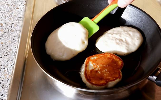 4. При небольшой температуре обжариваем оладьи с одной стороны под крышкой до золотистого цвета, 1-1,5 минуты. Будем переворачивать на другую сторону, первый, второй а третий не хочет, получилось. Накрываем крышкой и обжариваем до готовности. Друзья, посмотрите как оладьи растут на глазах. Очень хорошее тесто мы с вами сделали. Накрываем крышкой и продолжаем дальше обжаривать до готовности. Прошла ещё где-то одна минута, оладьи готовы, можно уже их снимать. И что же нужно сделать чтоб оладьи получились ещё нежнее...? В этом рецепте мы используем один белок куриного яйца, если вы добавите в тесто два белка - тесто получается намного воздушнее друзья, и оладьи у вас будут намного пышнее и нежнее. Попробуйте. Друзья, оладьи готовы. Приготовьте оладьи по этому рецепту. Уверен, что вам тоже понравиться.Видео рецепт ютуб ниже 👇