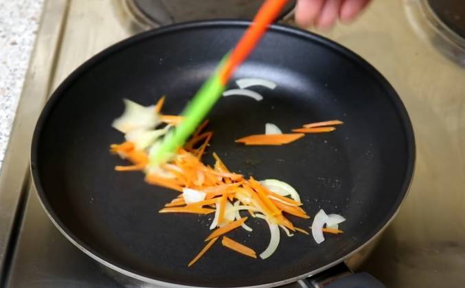 2. Остался последний продукт, который мы на режем - это лук зеленый. Нарезаем лук зеленый под небольшим углом. Подготовим яично-молочную массу для начала смешиваем яйца и молоко, добавляем соль, перец по вкусу; перемешиваем венчиком слегка взбиваем чтобы появилась небольшая пена. Вот пена уже появилась, масса готова. На разогретой сковороде с растительным маслом Будем пассеровать лук репчатый и морковь до полуготовности. Одну-две минуты. Периодически помешиваем. Прошло примерно 2 минуты укладываем слайсы помидора на овощ, прогреваем 5-10 секунд и заливаем яично-молочную массу.
