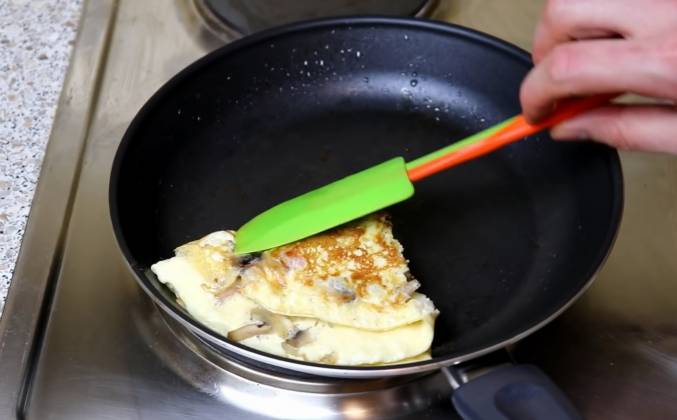 3. И накрываем крышкой, обжариваем омлет до готовности. Примерно 2 минуты Прошло 2 минуты - проверяем. Готовность омлета можно определить по поверхности. Чтобы омлет получился сочным и нежным. Нужно не пережарить омлет! Лучше снять омлет раньше с плиты и он дойдет от своей температуры на тарелке. Слаживаем омлет для подачи. Можно свернуть в рулет. Друзья не знаю как Вам! Но для меня омлет выглядит аппетитно. Хочется сесть.Видео рецепт ютуб ниже 👇