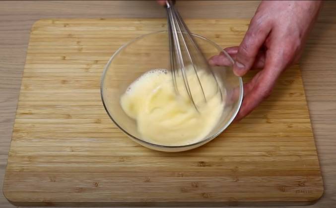 2. Подготовим яично - молочную массу смешиваем яйца и молоко, добавляем соль, перец по вкусу. Перемешиваем с помощью венчика, можно это сделать и вилкой или миксером. Слегка взбиваем чтобы сверху появилась небольшая пена. Вот видите пена появилась. Яично - молочная масса готова. На разогретую сковороду наливаем растительное масло добавляем лук репчатый и бекон, обжариваем примерно полторы две минуты. Периодически помешиваем чтобы у нас ничего не подгорело. Добавляем шампиньоны и обжариваем еще одну минуту. Добавляем яично-молочную массу. Сразу уменьшаем температуру чтобы омлет у нас не подгорел.
