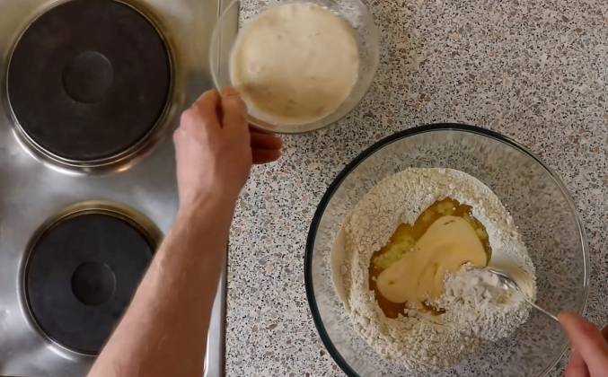 3. Хочу назвать пятое правило не держите долго опару. Если у вас молоко комнатной температуры то достаточно 10 минут для того чтобы подошла опара. Берем муку Делаем небольшую ямку в муку добавляем все продукты: масло растопленное, комнатной температуры, сахар с яйцом, сразу добавляем опару. Начинаем замешивать тесто с помощью ложки. На первый взгляд Вам покажется, что нужно добавлять муку. Но муку мы больше не добавляем. Шестое правило. Тесто должно быть мягкой. Дальше будем месить тесто руками) для того чтобы тесто не прилипало к рукам, смазываем руки маслом растительным. И последнее седьмое правило. Тесто нужно месить минимум 5 минут. Вот наше тесто, хочу обратить внимание, что теста должен быть мягкое.