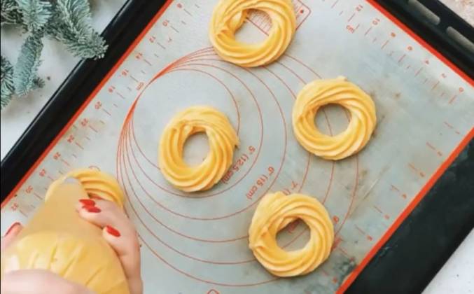 2. Взбивать долго не нужно, миксер тут нам помогает просто перемешивать тесто. Тесто должно получиться в меру тягучим, как на видео. Переложите тесто в кондитерский мешок с насадкой, на противне с пергаментом или ковриком отсадите кольца. Выпекайте в заранее разогретой до 170С духовке 20–25 минут. Рекомендую сначала попробовать сделать 3 колечка, чтобы разобраться со своей духовкой, отрегулировать время и температуру.