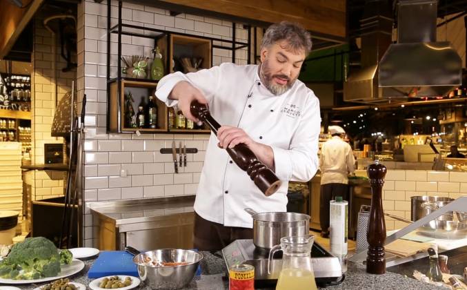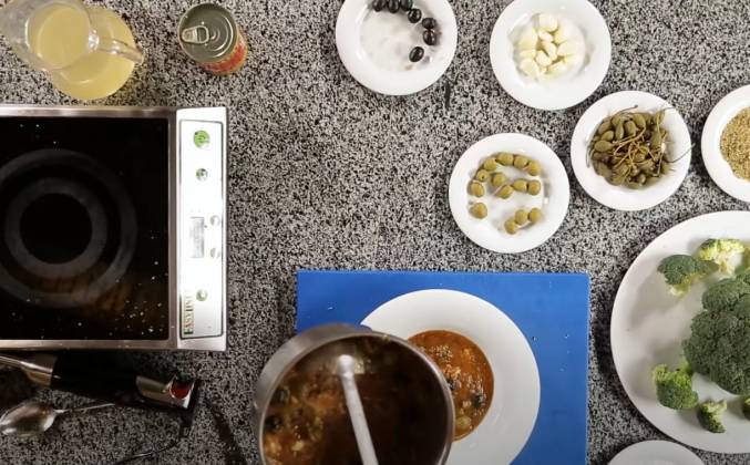 2. Берем брокколи. Брокколи режем обязательно маленькими-маленькими-маленькими кусочками. Потом отправляем туда брокколи. Оливки и маслины, то есть, оливки зеленые и оливки черные. Каперсы. Каперсы, вообще, бывают двух разных видов: бывают фрукты (плоды) - вот эти большие, вот эти с хвостиком. А бывают бутоны. Бутоны они такие маленькие-маленькие и соленые. Мы для этого рецепта используем плоды. Восстанавливающий супчик - это, вообще, очень хорошо! Вы чувствуете, что во время приготовления уже восстанавливается настроение (по крайней мере, настроение)? Туда добавляем немножко помидоров, баклажанов и немножко овощного бульона. Черный перец, соль. Это такая вегетарианская солянка из города Неаполя.