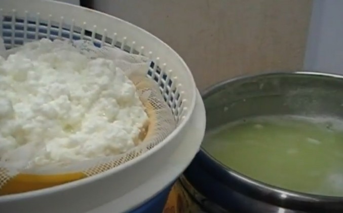 2. Молоко начинает собираться в сгусток и сейчас уже интенсивно мешать не надо газ подогрев у меня в это время уже выключен чтобы молоко не убежало я даю немножко остыть минут пять примерно и потом начинаю это собирать в форму формы у меня два дружка к застилаю марлю у меня тюль и выкладываю туда сгустки сыра шумовкой потому что мне по-другому неудобно.