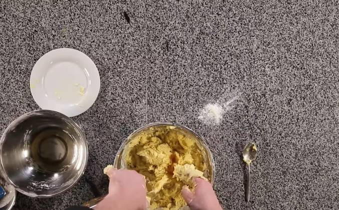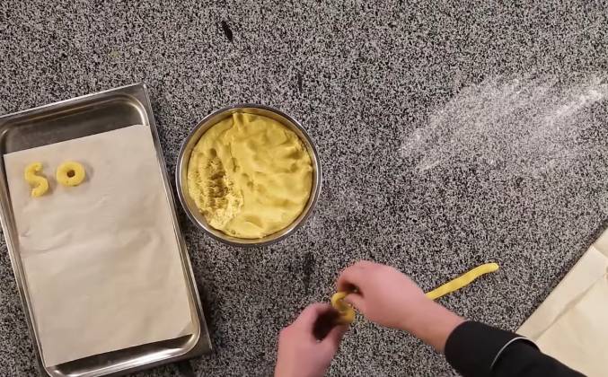 2. Можно теперь продолжать с ложкой, поскольку тесто стало чуть жиже. Вот и все! Перекладываем в чистую миску и оставляем его в холодильнике на часик. Вуаля! Смотрите, какой оно правильной консистенции: пластилиновой консистенции! Буранелли бывают двух разных форм: первая форма называется "буссолай" (слово "буссало" - это компас) и они абсолютно круглые. Вторая форма буранелли - это "эссель", то есть они делаются, как буква S (латинская). Делается мощнейшая колбаска и потом руками делаем вот так. Это - буссолай, а это S. Вот так. И еще одна S. Это, в том числе, на море очень важно, потому что, на всякий случай, можно подать тревогу. А теперь запекаем их при температуре 180 градусов около 15-20 минут. Вот, запеклись.