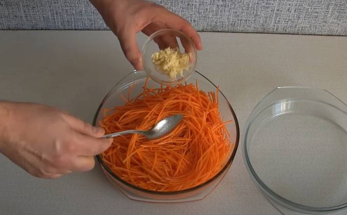 3. Теперь маринад заливаем в кастрюлю с морковкой. И добавляем натертый на терку либо можно использовать давилку измельченный чеснок. Перешиваем. После того как мы морковку хорошенько перемешали Закрываем кастрюлю крышкой И даем морковки промариновать. Мариноваться она будет примерно сутки. Через 5 или 6 часов можно достать миску из холодильника и еще раз перемешать морковку с маринадом, что бы она лучше про мариновалась.Видео рецепт ютуб ниже 👇