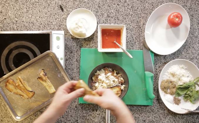 2. Томаты в собственном соку. Добавляем без фанатизма так как делается пицца ложкой кладут вот так везде и потом берем. Моцарелла ее не режем а руками, сыпим прямо она сыпится потом сверху пармизан который натерали на крупной терке и чуть-чуть, если хотите сухой оригано. Наш первый ряд, наш первый ярус завершился успешно. Всем аплодисменты. Теперь второй тоже самое без фанатизма, а то у вас получится слишком жидкий и потом будет течь. На самом деле он немножко течет. Если вы будет есть такое горяченькое. Потому что на самом деле ее можно есть в том числе и холодной. Если вы собираетесь есть ее холодной тогда по-больше кладите соуса, чтоб стало сочнее, чтобы когда. Засохнет чуть-чуть. Будет идеальна консистенция. Моцарелла. Пармизан и. Оригано.