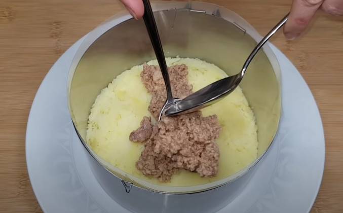 2. На картошку выкладываем печень трески Разравниваем. На печень трески выкладываем зелёный лук. Разравниваем и покрываем сеточкой из майонеза На лук выкладываем натёртую морковь. Разравниваем и промазываем майонезом Следующим слоем, выкладываем натёртые огурцы Разравниваем и промазываем майонезом На огурцы выкладываем натёртые яичные белки Разравниваем и промазываем майонезом Последним слоем выкладываем натёртые яичные желтки.