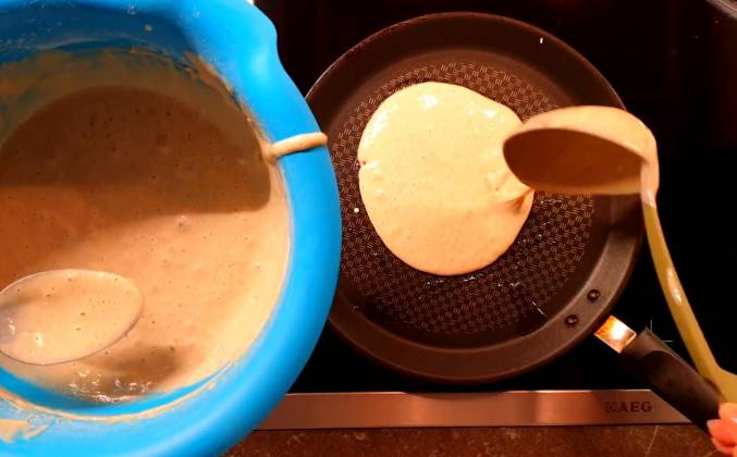 3. Я попробую вот такой вот ёмкостью набрать тесто и его выложить на сковородку. Ну, да, так аккуратнее получается. Я уменьшила огонь на троечку. 4 — уже слишком сильный. Какой узорчатый! Посмотрите, какой узорчатый. Я рекомендую! Пятерочка! Прям зачет по полной. Друзья, если вам понравилось это вкусное гречневое видео, ставьте лайки, подписывайтесь на мой канал и давайте готовить вмест! Всем пока! Ну, они очень вкусные! Идеально- идеально-идеально. Ой! Ой-ой-ой! Ой-ой-ой-ой-ой! Ой- ой, кажется, добавила сахар в муку. Ёшкин котошкин. Конечно, этот процесс, вот этих бульбашек, очень занимательный. Хочется их даже полопать. Вы так не делайте, конечно. Всё, готов у нас первый оладь, он же панкейк, он же вкусняшка.Видео рецепт ютуб ниже 👇