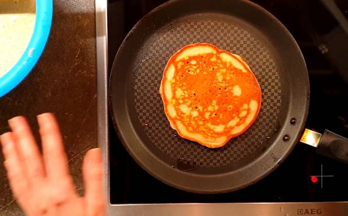 2. На среднем огне жарим, на небольшом, чтобы они не сгорели. Видите, какие пузырьки прикольные? У меня максимум 9 на плите. Сейчас у меня на четвёрочку. Для этих оладий обязательно-обязательно используйте масло для жарки и антипригарное покрытие. Так у вас сто процентов все получится. Очень даже красивый. Все перевернулось. Я очень довольна, очень. Мне очень нравится. Вы чувствуете-чувствуете запах? Очень вкусно пахнет! Также хочу заметить, что этот рецепт я не называют ПП рецепт, да, "правильное питание". Ну, друзья, ну тесто жаренное на масле, вообще на сковородке... Ну, какое это ПП? Вы прикалываетесь? Я там просто вижу иногда рецепты. ПП рецепты — блины там на рисовой муке, на кукурузной, на гречневой... "ПП рецепт". Ну-ну. Вот, я вам покажу со второй стороны как он сделался. Вот такой будет очень- очень классный.