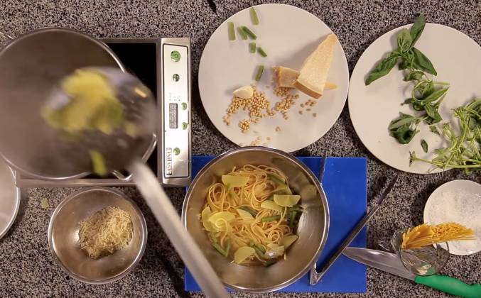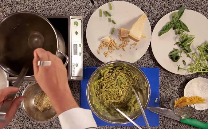 2. Вот такая консистенция должна быть. Все. Нам удалось! Теперь: здесь, именно здесь, начинается самый величайший тонкий генуэзский рецепт по приготовлению пасты с Песто. Достаточно взять мощнейшие лингвини. У нас вода кипит, почти. Добавляем туда морскую соль. Вот так. Картоха! А почему именно картошка? Картошка, потому что это - основной ингредиент нашей пасты. Картошку режем максимально тонко. И кладем ее сюда. Берем мощнейшее количество стручковой фасоли. И кладем ее тоже туда. Але! Все туда, давайте все туда! Чесночелло тоже туда! Закипело! Так. Не ломайте! Не ломайте, а делайте так: берете вот так, скручиваете ее вот так, и вот так! Помешайте ее хорошенько, помешайте! А то они слипнутся и потом невкусно будет. О! Готово. Готово! В каком состоянии они должны быть? Они должны быть в состоянии "до аль денте", потому что до "аль денте" они сейчас дойдут. Аль денте - это переводится, как "на зуб". То есть "на зуб" должно быть так: "тык". Если у Вас не делается никакой "тык", значит Вы все неправильно сделали.