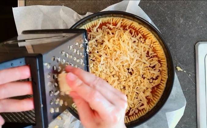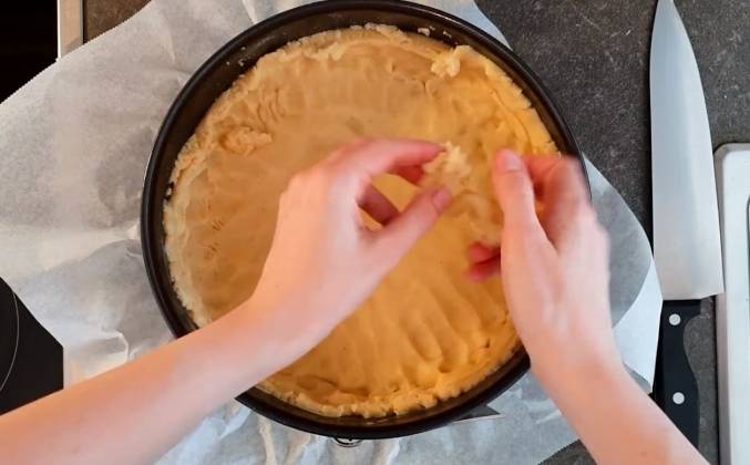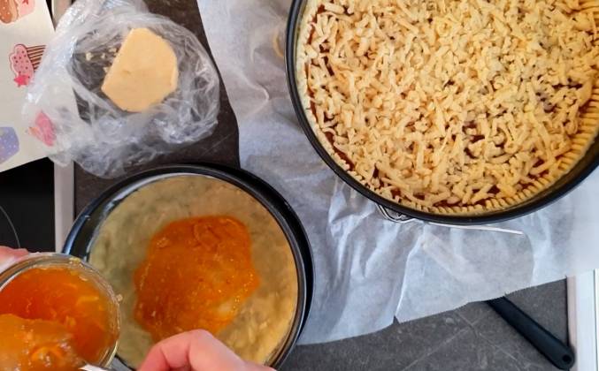 4. Я пергамент не постелила. Но, тут ничего не протечёт. Аа! Кстати, чтобы так не получилось, вы можете делать слой теста толще делать внизу. Не сильно его разминать. Но, я люблю потоньше. Потом оно разбухает и будет отлично. Смотрите сами. Можете так сделать. Можете так, как я. Я просто натру сюда это тесто. Потому что не раскатаю. Оно холодное, замороженное. Теперь от тепла наших горячих рук оно немного подтает. Надо, чтобы оно всю форму заняло. Ещё немножко сюда уберу.. Как я и хотела. Тут будет немного, а тут будет ещё один пирог. Желательно, чтобы какие-то бортики получились. Ну да. Прямо маленькие бортики, видите? Ещё можно немножко потереть. Друзья, я вас умоляю, объясните мне в комментах, кто знает. Какая разница между джемом, повидлом и мармеладом? Я вообще не знаю, какая разница. просто не знаю. Немного сюда добавим. Это апельсиновое такое оно, с цедрой. Ещё вот так ложку и всё. Да, я потру на мелкую здесь. Однозначно. Мне неудобно. Я потру на тарелку и потом распределю по пирогу равномерно.