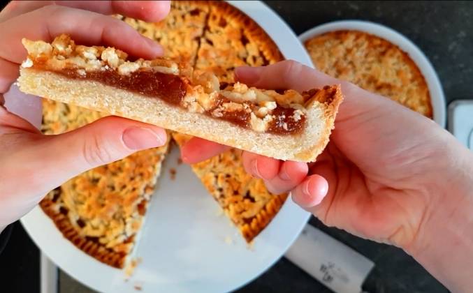 3. И сейчас я вам покажу один приёмчик. Вот берём и прижимаем. Вот так. Открываем банку с повидлом. И натираем наше тесто. Мне нравится, когда теста немного сверху, когда проглядывает повидло. Но, боюсь, что в этой версии у меня это сегодня не удастся. Потому что я очень большой кусочек отрезала. Сразу этот использую. Для этого пирога подходит варенье с кислинкой. Сливовое, может вишнёвое. Но, кислинки мне хватило и в картошке с мятой. Сегодня хочу без кислинки. Кстати, ссылку оставлю под видео Картофель с мятой. Очень вкусный картофель, но для гурманов. Каждый день такую картошку есть нельзя. Она вкусная, но её надо на особенный случай готовить. И очень хорошо к сёмге подойдёт. У меня ещё 2 кусочка теста. Вот куда мне их тереть? Хотите, дотерайте 2 кусочка. Я этого делать не буду. В общем, экспериментируем как умеем.