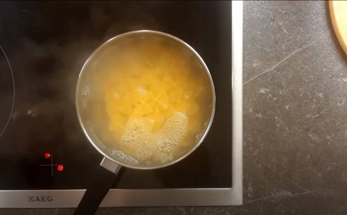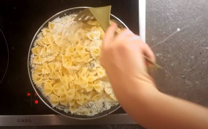 2. Перемешаем немного. На этом этапе я предлагаю добавить соль и перец. Соль по вкусу. У меня примерно 0, 5 ч. л. Смесь перцев. Тут главное не перекрутить. Ну, и приправу сразу засыплю. Всё это дело перемешаем и обжарим примерно минуту. Добавляем наш маскарпоне. Конечно, сюда его надо в 2 раза меньше добавлять. 100 г сюда лучше добавить. Но... куда я его дену?.. Будет посытнее. Если вы не пробовали маскарпоне, это те же сливки, только супер мега густые. Просто вкус один в один. Друзья, добавлю четверть стакана воды. И посмотрю, что из этого получится. Надеюсь, оно не сильно расслоится, отслоится. Знаете, я знаю, что загустеет, по этому я сразу добавлю всю воду. В общем, полстакана нам нужно. Сразу соль добавлю. Где-то 0,5 ч. л. И ещё перца. Пускай себе тушится 5 мин. Прошло 5 мин., добавляем сыр, натёртый на тёрке. Перемешиваем до растворения сыра. Сейчас самое время попробовать соус на вкус. Bellisimo! Супер! Выкладываем наши макаронные изделия, воду я уже слила. Перемешиваем. Буквально 1 мин. и блюдо готово.