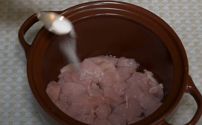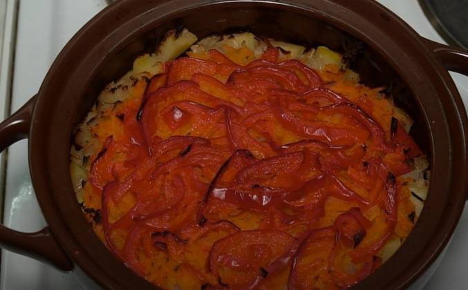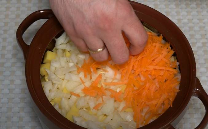 2. И остается только лук репчатый, его измельчаем тоже кубиками, но конечно же значительно меньше. С заготовками всё. Берем горшок, у нас один общий как кастрюля большой, можно конечно делать и в порционных. Не вижу особой разницы. Немного масла растительного на дно и начнем укладывать слоями наши заготовки. Первым делом идёт измельченная курица. Немного соли и перца молотого сверху и можно укладывать капусту. За ней идет слой картофельных кубиков. Их как и курицу стоит обязательно посолить. Далее укладываем измельченный лук репчатый, морковь натертую и перец нарезанный болгарский.